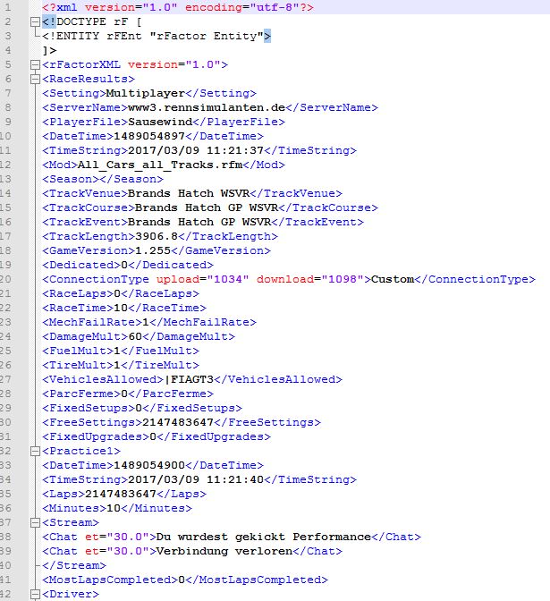 ich wollte mal schauen ob mir die Reporter ausnahmsweise mal gesonnen sind. :unsure: Leider musste ich feststellen, dass alle Server auf "all cars all tracks" geschaltet waren, außer einer der war mit der "Endurance Series" belegt. Also blieb mir nichts anderes übrig als von "A. M. FIA GT3" auf "all cars all tracks" zu gehen. Da gestaltet es sich etwas schwierig das passende Auto zu finden, weil die etwas verstreut in der Liste auftauchen. und nicht als Paket wie "Endurance Series". Nachdem ich Server 3 auf "Brands Hatch GP" umgeswitcht hatte fuhr ich los. Aber nur ein paar Meter, dann hieß es " <Chat et="205.2">Du wurdest gekickt Performance</Chat>" . Als Zugabe hieß es "rFactor funktioniert nicht mehr. Die Ursache wird gesucht." Ob es daran lag dass der Server sich daran verschluckt hat dass vielleicht nicht auf die Mod geschaltet war vermag ich nicht zu sagen. Aber da bewusste Fehlermeldung schon mal bei dem VLN Mini-Event auftrat, und da war wohl definitiv richtig eingestellt, können wir uns auf einen interessanten Abend einstellen. Vielleicht so wie der gestrige. Da wollte ich doch diese Woche rFactor 2 ordern, allerdings mit kompetenter Hilfe. Aber als ich gestern als Zaungast festgestellt habe, was das für ein Desaster war denke ich noch mal darüber nach. :S