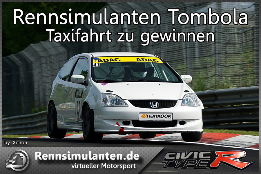 Zum Simulantentreffen veranstalten wir dieses Jahr eine Tombola, bei der man eine Taxifahrt im Honda Civic Type R während des offiziellen Trainings zum VLN-Lauf mit unserem Member Xenon auf der Nordschleife gewinnen kann.
