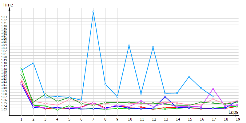 [218.1 sec] Mister T ends the lap in position 1 and sets the fastest lap - 1:03.905